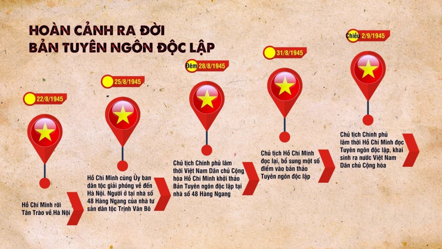 Ngày 2/9/1945, tại Quảng trường Ba Đình, Chủ tịch Hồ Chí Minh đọc bản “Tuyên ngôn độc lập” lịch sử do chính Người chuẩn bị, trịnh trọng tuyên bố trước toàn thế giới, trước cuộc mittinh khổng lồ của hàng chục vạn nhân dân, thay mặt Chính phủ lâm thời, Chủ tịch Hồ Chí Minh trịnh trọng đọc bản Tuyên ngôn Độc lập, tuyên bố khai sinh ra nước Việt Nam Dân chủ Cộng hòa - Nhà nước công nông đầu tiên ở Đông Nam Á. Từ đây, đất nước ta bước vào kỷ nguyên mới- Kỷ nguyên độc lập, tự do và chủ nghĩa xã hội.