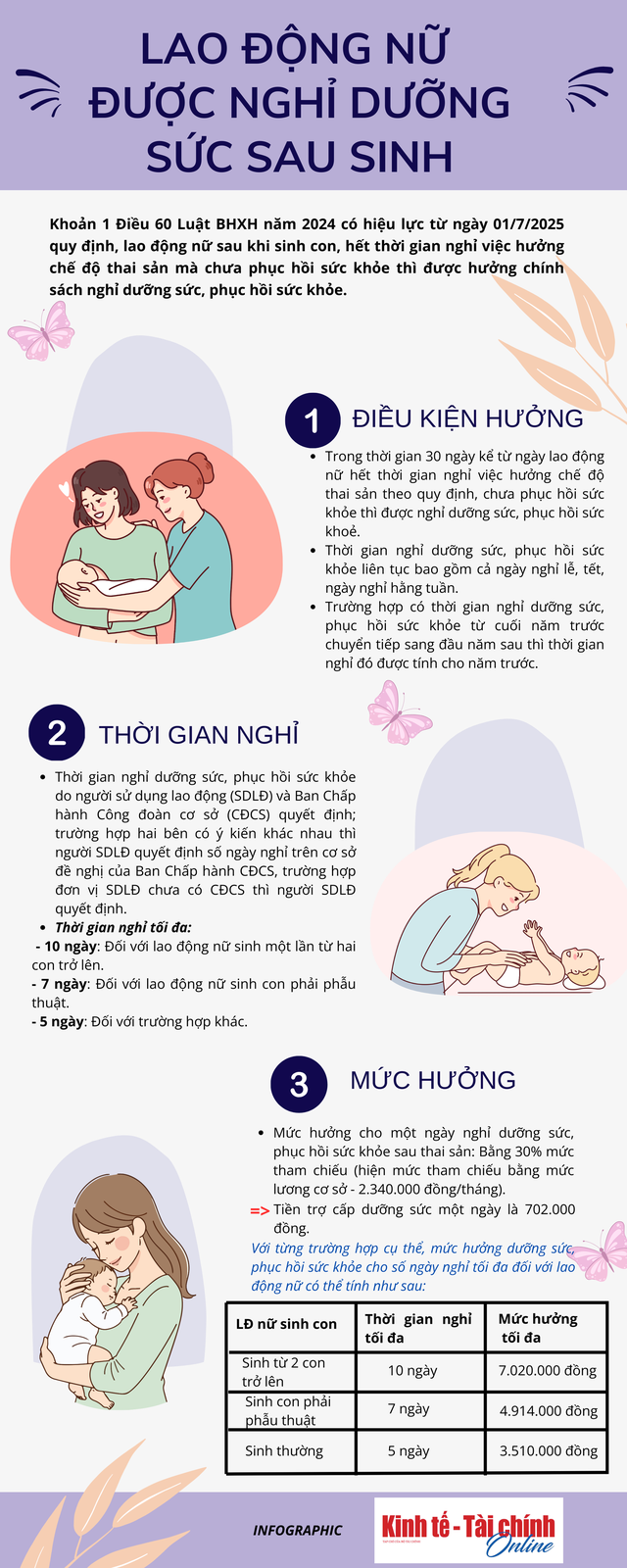 Khoản 1 Điều 60 Luật BHXH năm 2024 có hiệu lực từ ngày 1/7/2025 quy định, lao động nữ sau khi sinh con, hết thời gian nghỉ việc hưởng chế độ thai sản mà chưa phục hồi sức khỏe thì được hưởng chính sách nghỉ dưỡng sức, phục hồi sức khỏe.
