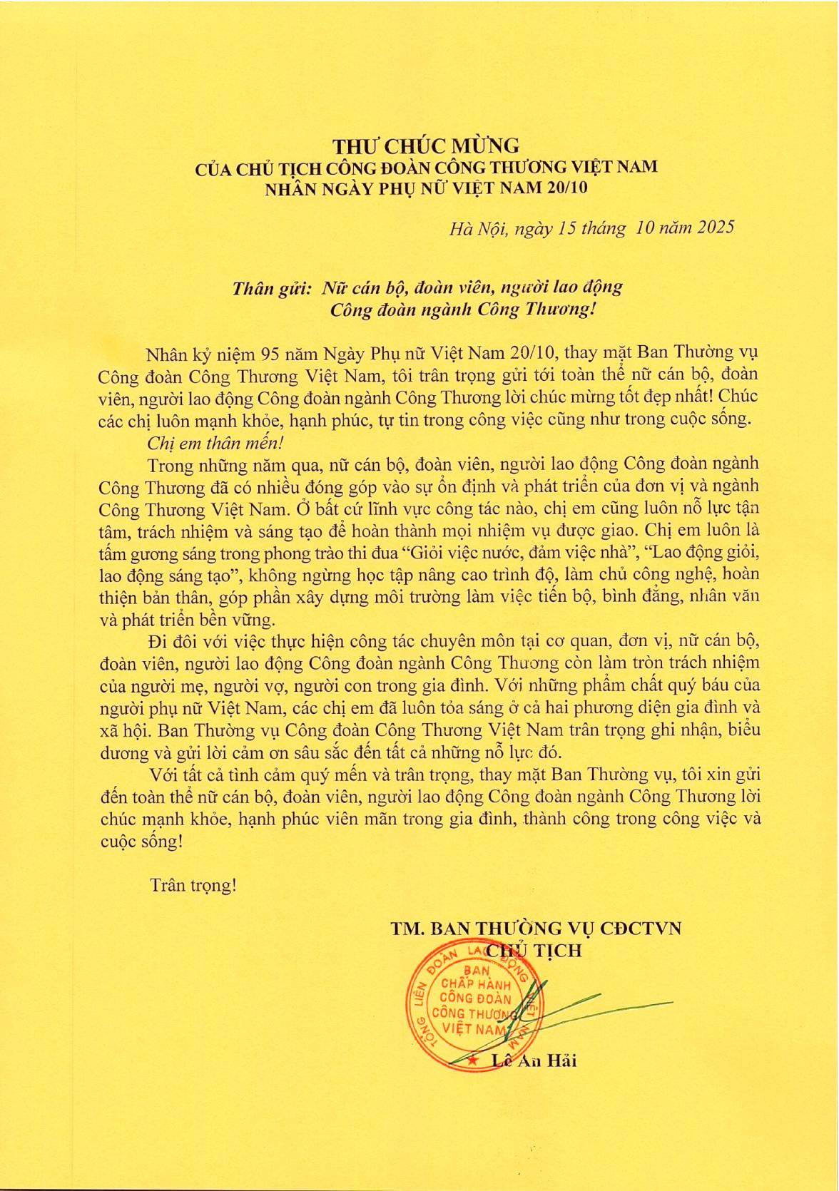 Thư chúc mừng chủa Chủ tịch Công đoàn Công Thương Việt Nam Nhân ngày Phụ nữ Việt Nam 20/10