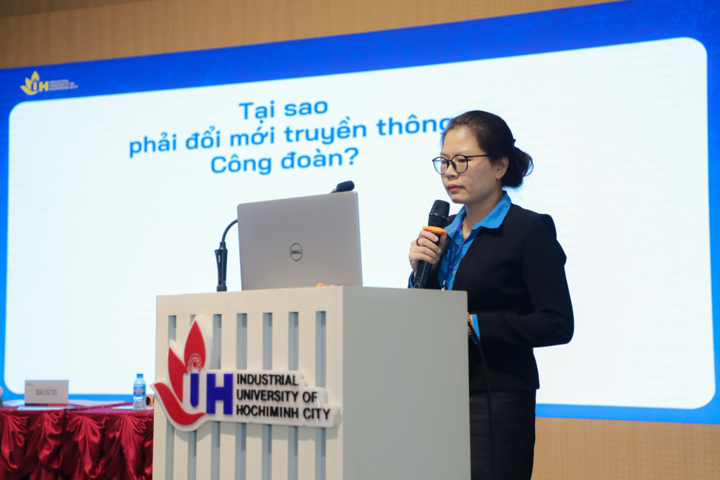 Đồng chí Nguyễn Thị Thương - Uỷ viên Ban Chấp hành Công đoàn trường, Giám đốc Trung tâm Thông tin - Truyền thông trình bày tham luận tại đại hội