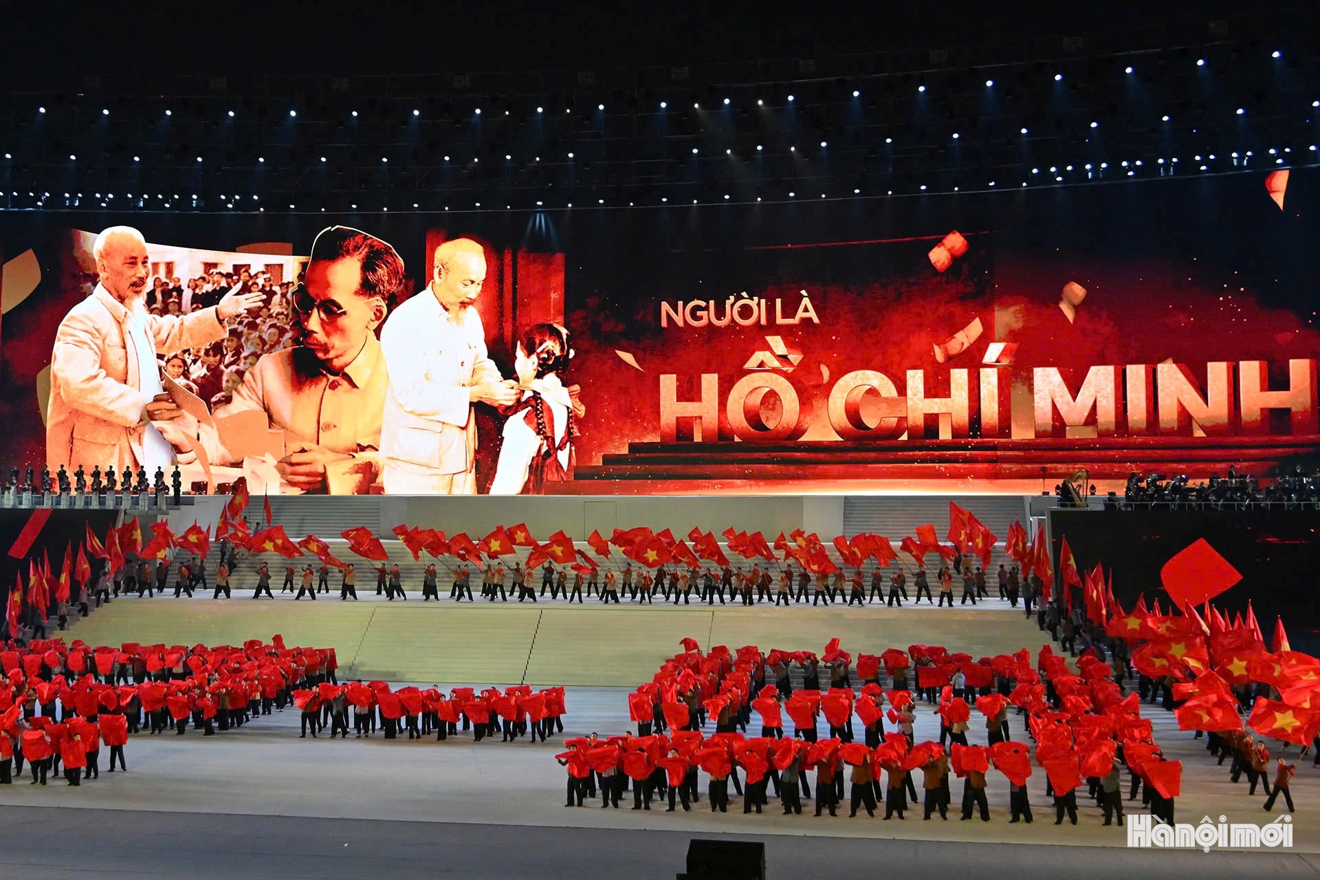 Chương trình nghệ thuật “Dưới lá cờ vẻ vang của Đảng” bày tỏ lòng tri ân sâu nặng đối với Chủ tịch Hồ Chí Minh vĩ đại. Ảnh: HNM
