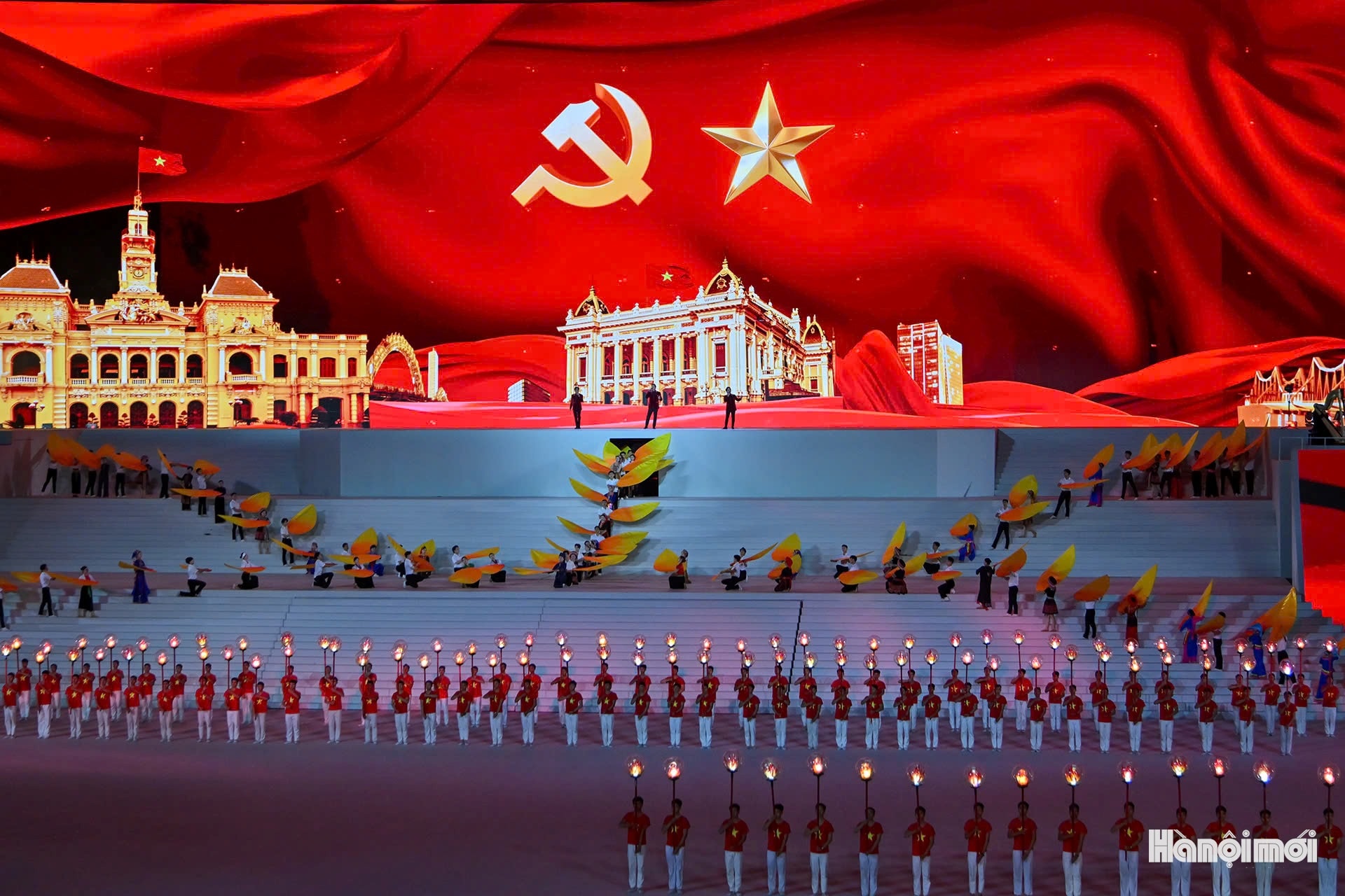 Chương trình nghệ thuật “Dưới lá cờ vẻ vang của Đảng”, khẳng định vai trò lãnh đạo của Đảng Cộng sản Việt Nam. Ảnh: HNM