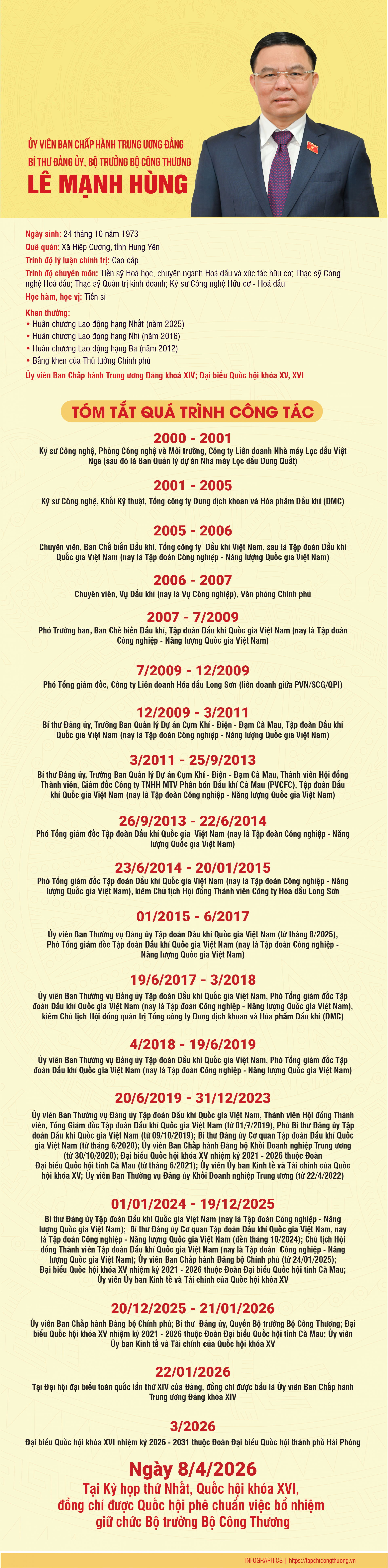 Bộ trưởng Bộ Công Thương Lê Mạnh Hùng, sinh ngày 24/10/1973; quê quán: xã Hiệp Cường, tỉnh Hưng Yên. Trình độ lý luận chính trị: Cao cấp. Trình độ chuyên môn: Tiến sĩ Hóa học; Đại học chuyên ngành hóa Hữu cơ-Hóa dầu. Thạc sỹ quản trị kinh doanh...