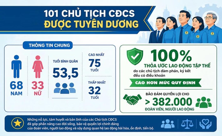 Ngày 28.4, Tổng LĐLĐVN sẽ tuyên dương 101 chủ tịch công đoàn cơ sở (CĐCS) xuất sắc tiêu biểu của cả nước. Đây là những Chủ tịch CĐCS được lựa chọn từ 127 gương điển hình do công đoàn địa phương và ngành đề xuất, bởi một hội đồng làm việc khách quan, nghiêm túc, trách nhiệm.